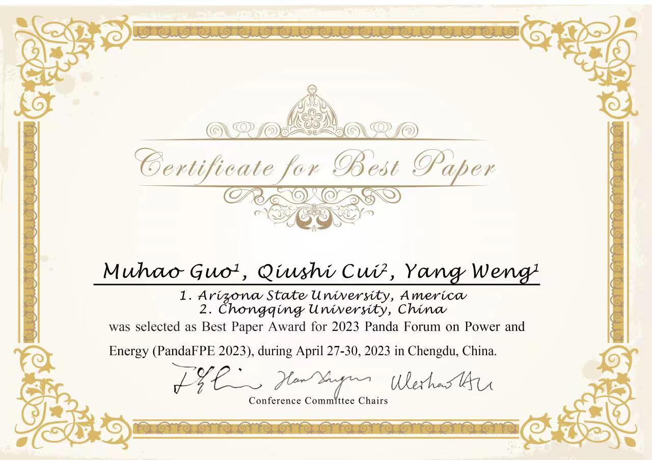 Best Paper Award, Panda Forum on Power and Energy, Chengdu, China, Apr 2023. Letter.