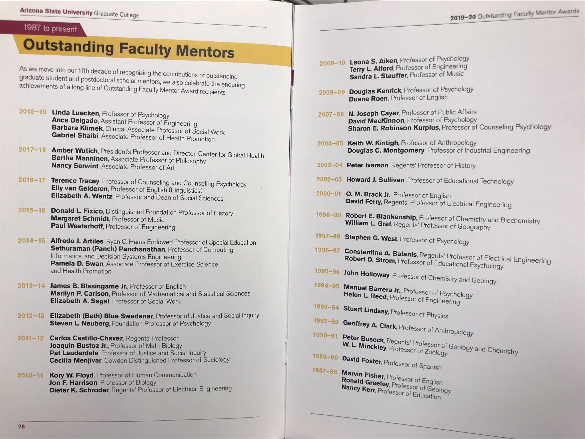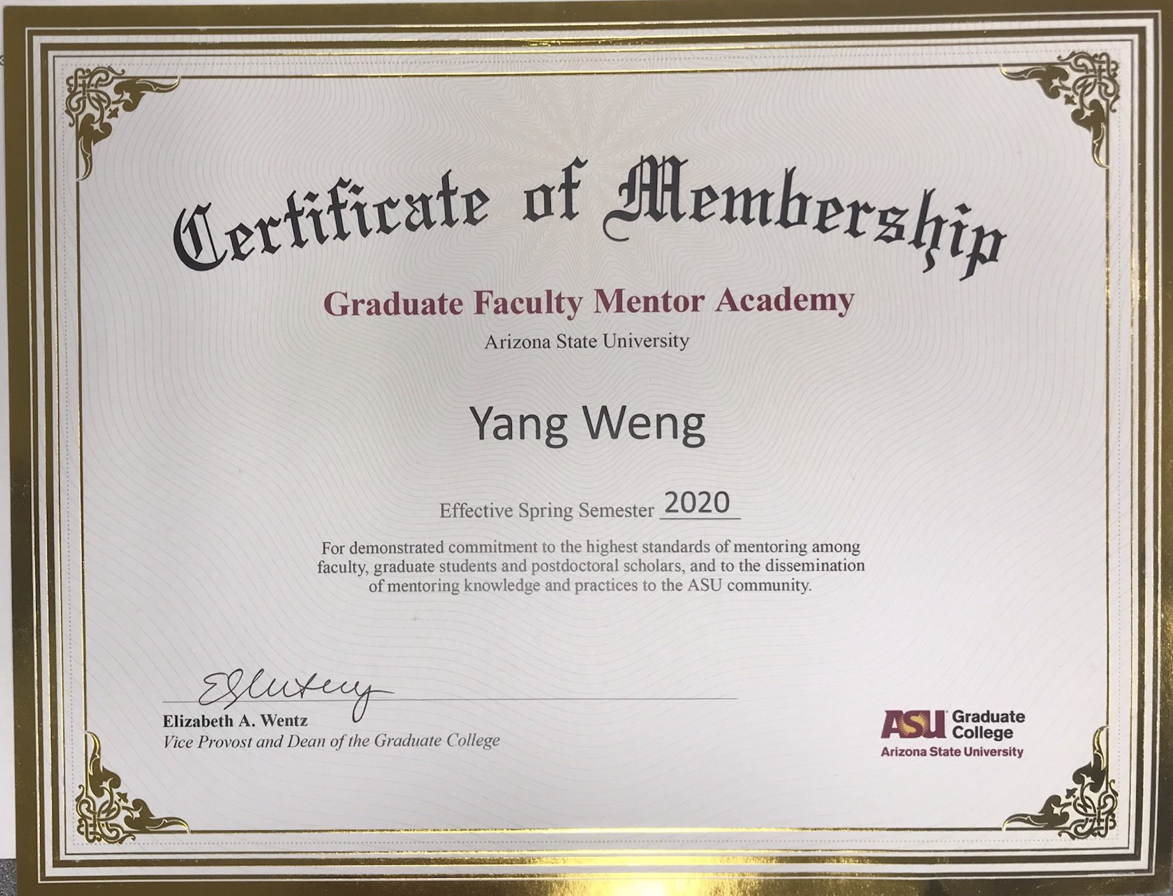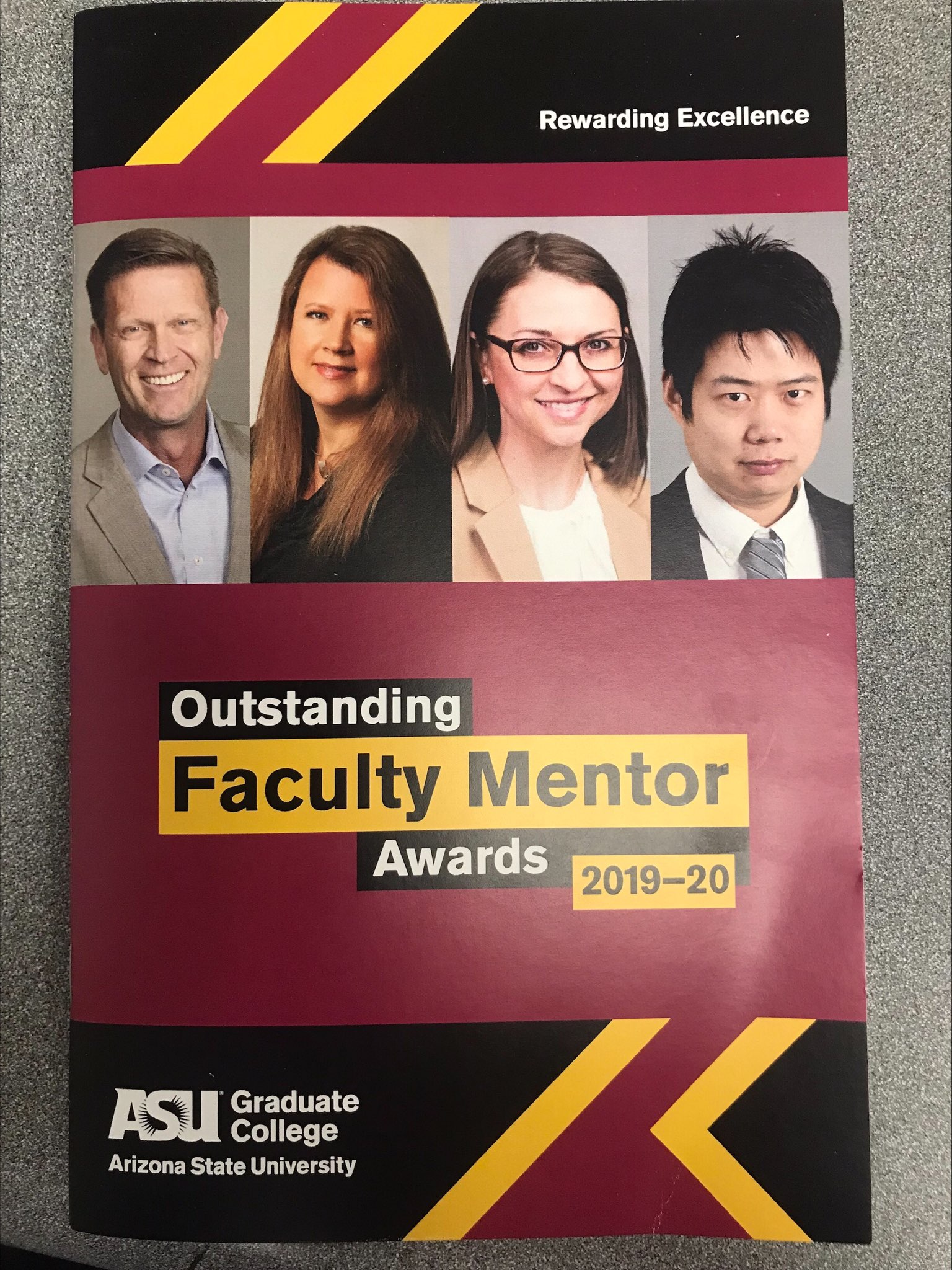 Outstanding Faculty Mentor Award, Graduate School, ASU, Feb 2020. Link, Certificate, Magazine, Past receiver