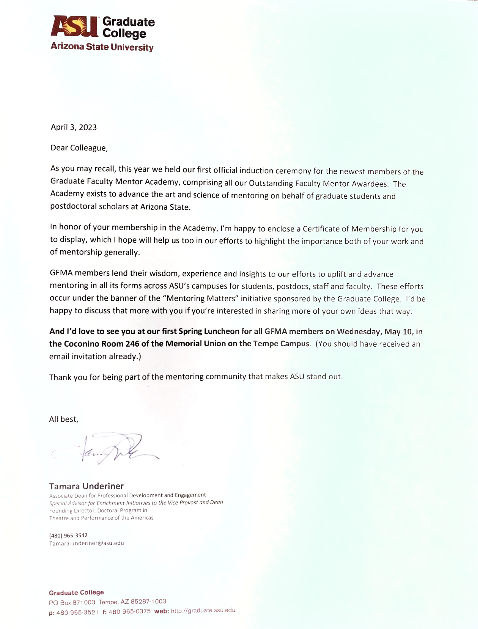 Graduate Faculty Mentor Academy, Graduate College, ASU, Apr 2023. Letter, Past receiver